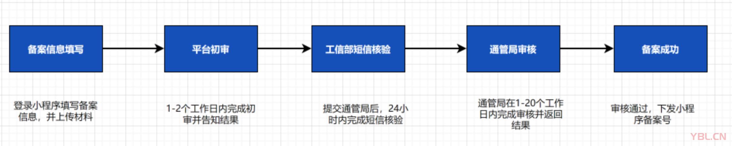 備案整體流程總共分為五個環節:備案信息填寫、平臺初審、工信部短信核驗、通管局審核和備案成功。